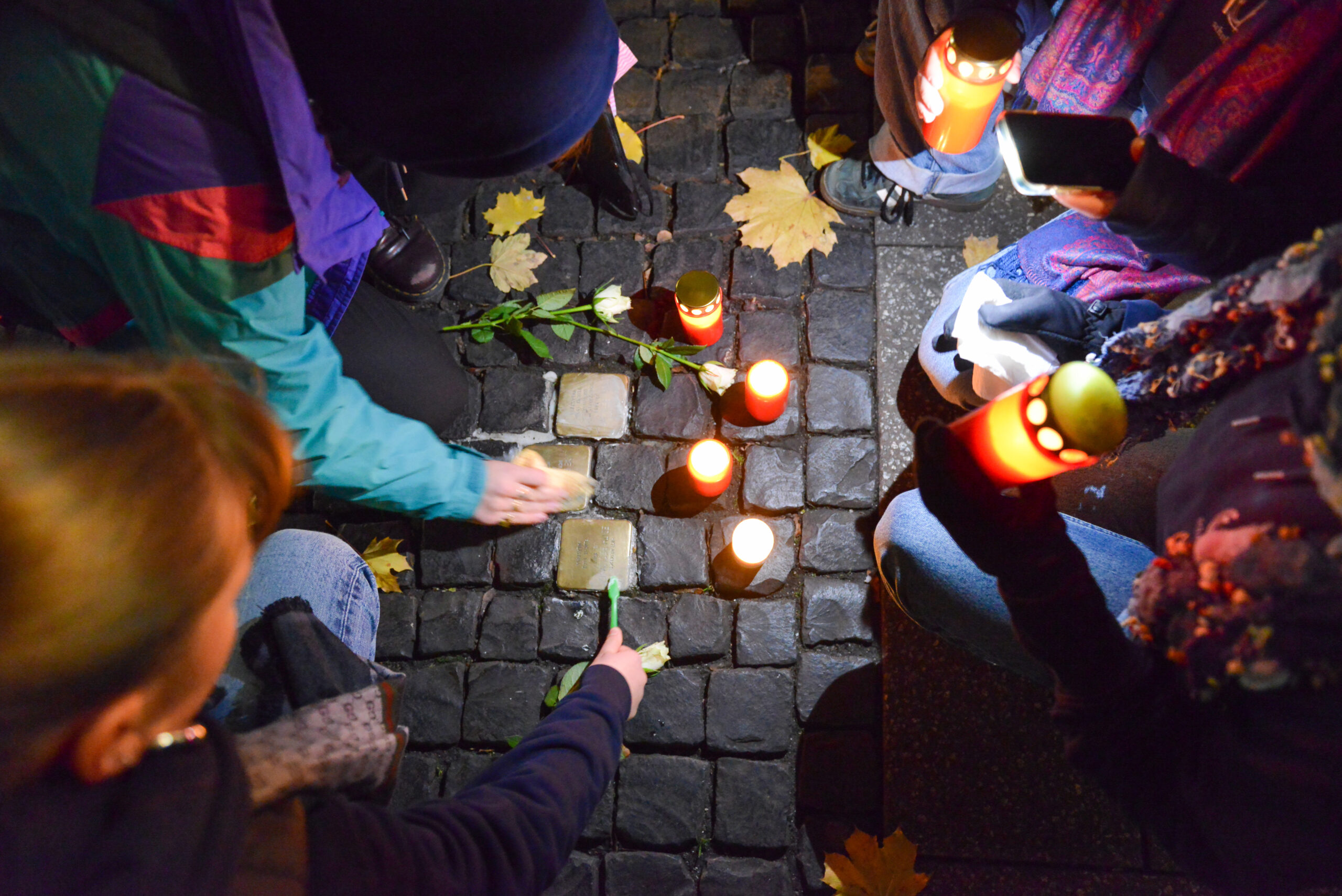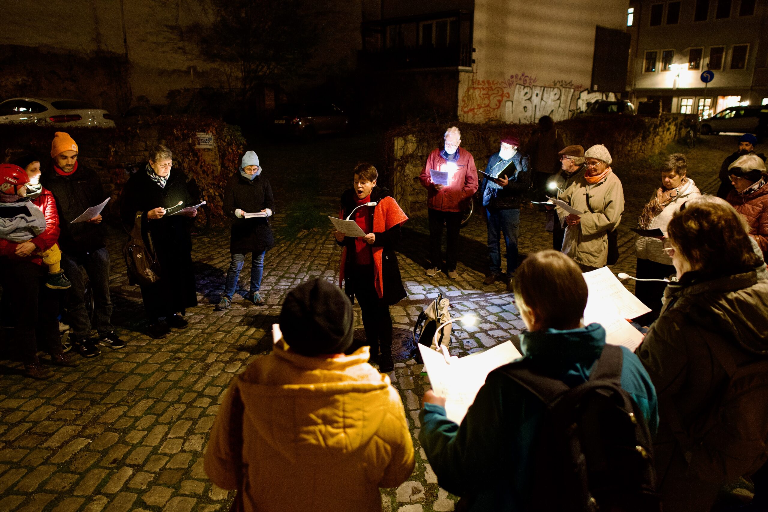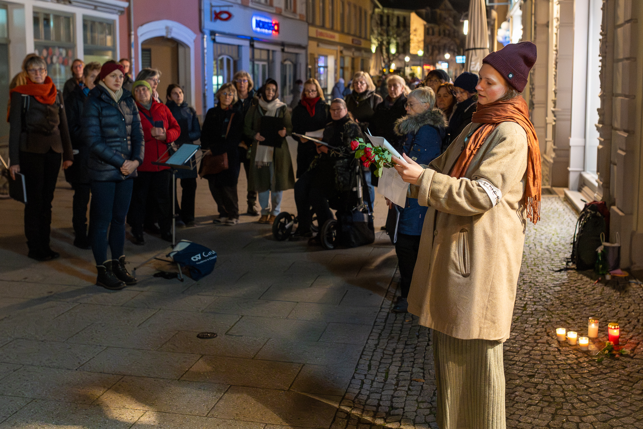 Nach einem gemeinsamen Auftakt am Marstall verteilten sich die Teilnehmenden auf neun Stolpersteine in der Stadt, wo die Lebensgeschichten der Personen vorgelesen und mit Kurzkonzerten Weimarer Chöre an sie erinnert wurde.