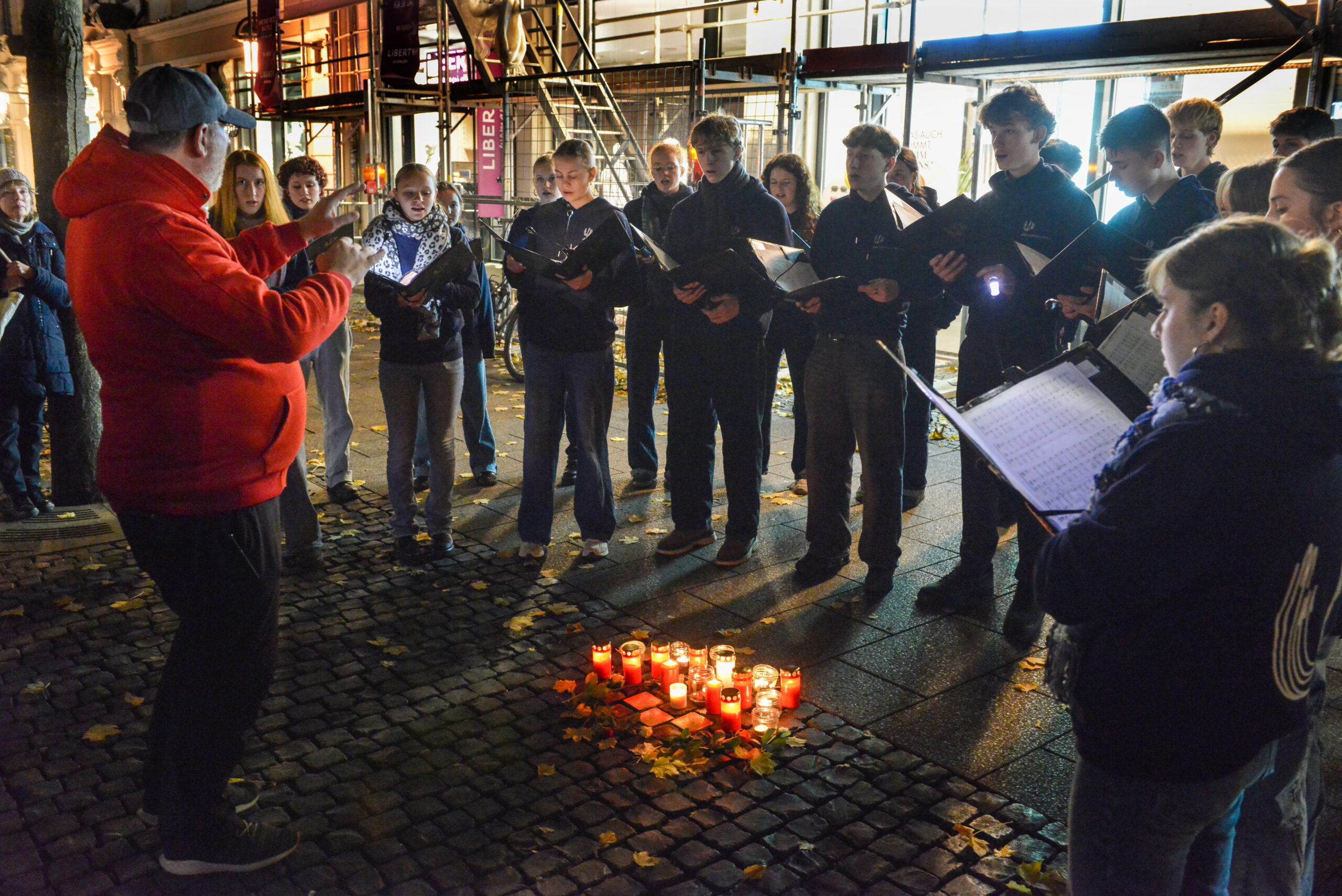 Zum Abschluss kamen alle auf dem Theaterplatz zusammen. Nach einer Rede von Rikola-Gunnar Lüttgenau stimmten die Anwesenden gemeinsam das jiddische Lied „Dos Kelbl“ an und gedachten in bewegender Atmosphäre den Menschen, die durch das NS-Regime verfolgt und ermordet wurden.