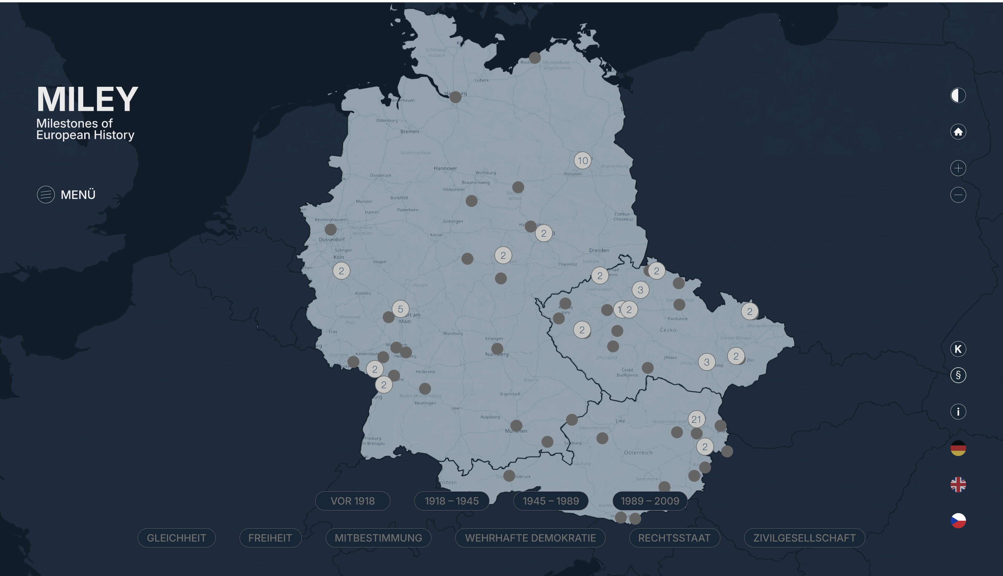 Das Projekt MILEY – Milestones of European History macht Demokratiegeschichte erlebbar und greifbar – mit einer digitalen Karte, die wichtige Orte der Demokratisierung in Österreich, Deutschland und Tschechien zeigt. Es verbindet Geschichte mit aktuellen Lern- und Lehrformaten und fördert so das Verständnis für demokratische Prozesse und gemeinsame europäische Werte. Entdecke, lerne eigenständig und vertiefe dein Wissen mit interaktiven Inhalten, die in Deutsch, Tschechisch und Englisch verfügbar sind. Demokratie ist kein abstraktes Konzept, sondern gelebte Geschichte an konkreten Orten – genau das zeigt MILEY.